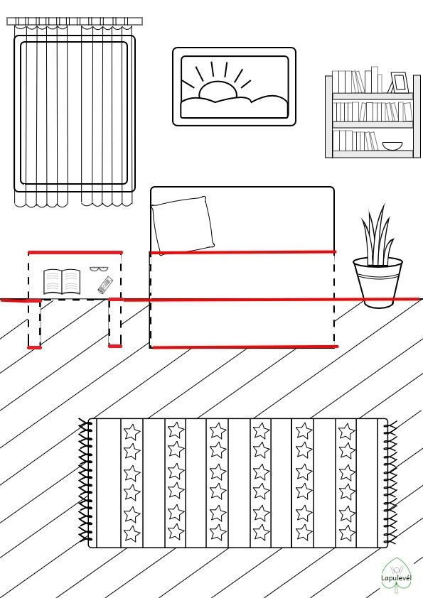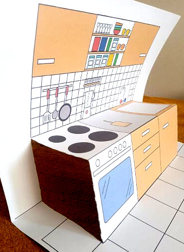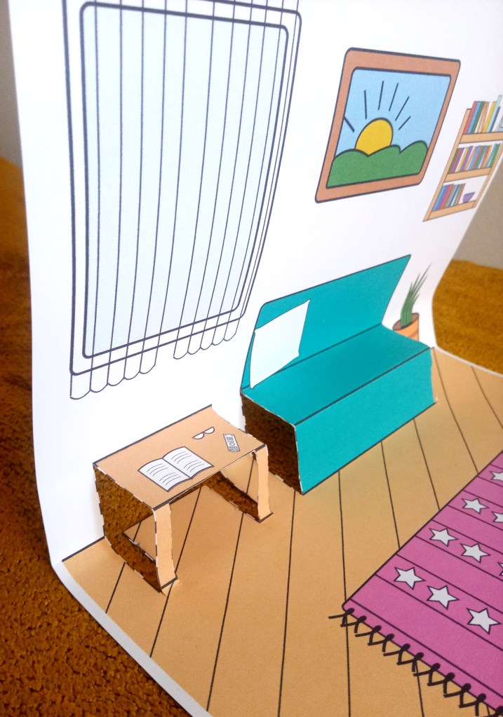 Ha megtaláltátok a hajtásvonalakat, vonalzó és tompa hegyes tárgy segítségével (pl. kifogyott golyóstoll, villa, olló tompa vége) karcoljátok meg azokat, így könnyedén behajthatóak lesznek. És máris megelevenednek a térbeli szobák! A maketteket szerepjátékon kívül használhatjátok környezetismeret órán, vagy idegennyelv tanulásakor.