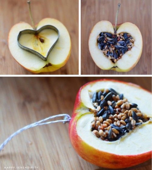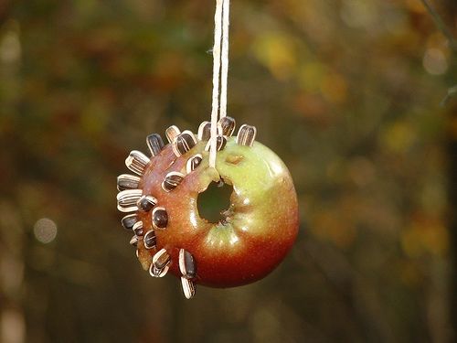Az csutkázott almába nyomkodott (pörköletlen, sótlan!) szotyola az egyik legegyszerűbb módja a madáretetésnek. (Forrás: http://www.flickr.com)