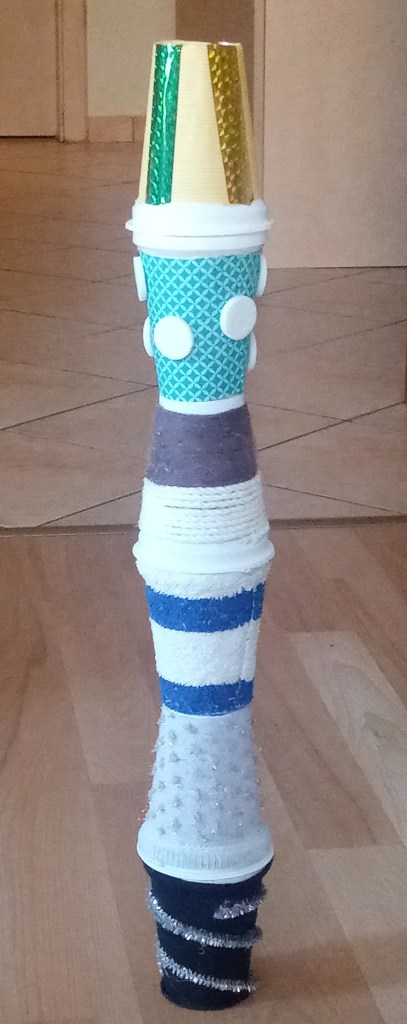 A műanyag poharakra tapintásban különféle hulladék textíliákat, papírokat, itthoni limlomokat ragasztottam. A pohár alakja nem henger, hanem csonka kúp. Emiatt bonyolultnak tűnhet a bevonása, ám nem az.