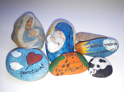 Azonban szöveg nélkül is sokat adhatunk. Anyukámtól gyermekeim születésekor a két Szűzanyás kavicsot kaptam. Az egyik végigkísérte a 15 órás küzdelmet és a kórházi napokon is a táskámban őriztem.