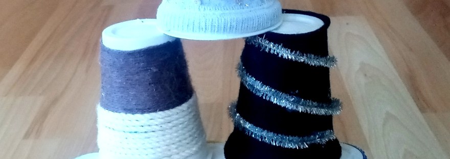 A műanyag poharakra tapintásban különféle hulladék textíliákat, papírokat, itthoni limlomokat ragasztottam. A pohár alakja nem henger, hanem csonka kúp. Emiatt bonyolultnak tűnhet a bevonása, ám nem az.